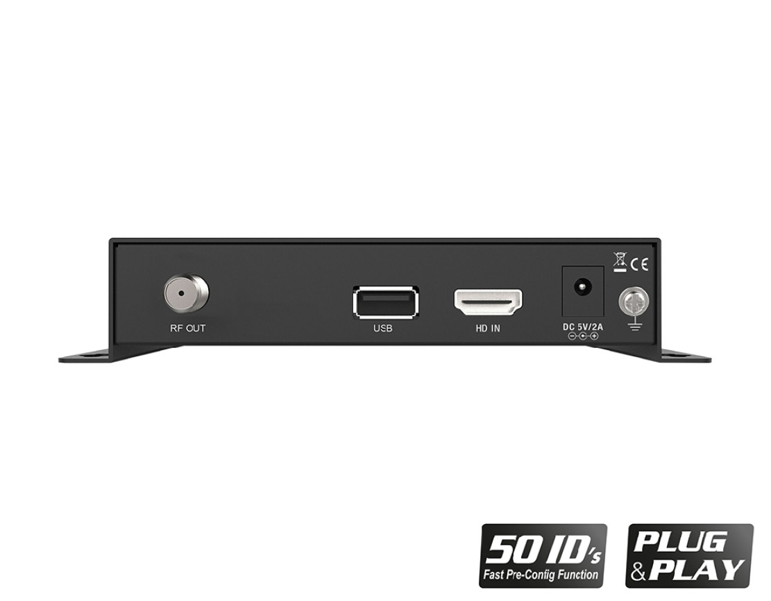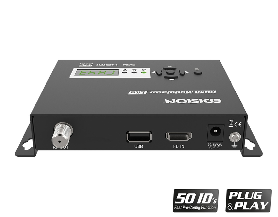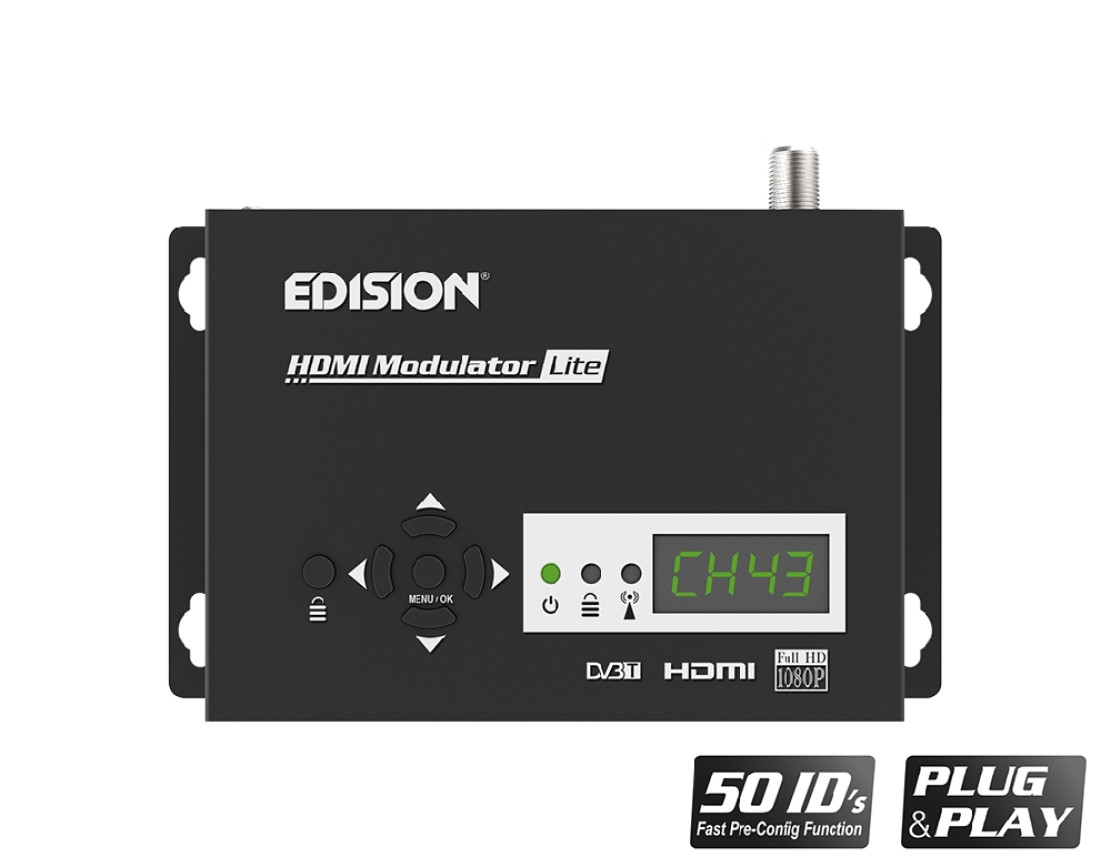 Περιγραφή EDISION HDMI MODULATOR liteΨηφιακός μονοκάναλος HDMI διαμορφωτής, με έξοδο Επίγειου ψηφιακού DVB-T VHF/UHF MPEG4 σήματος. Διαθέτει έτοιμες και πολύ εύκολες ρυθμίσεις για κάθε τύπο εγκατάστασης. Απο κάθε συσκευή με HDMI έξοδο (δέκτες δορυφορικού & επίγειου ψηφιακού τηλεοπτικού σήματος, κάμερες, DVD, DVR και κάθε άλλη πηγή-συσκευή εξόδου σήματος HDMI) παράγει MPEG4 ΕΠΙΓΕΙΟ ΨΗΦΙΑΚΟ σήμα έως FULL HIGH DEFINITION 1080p, με επιλογή εξόδου σε μπάντα VHF ή UHF. Παρέχει εξαιρετική ποιότητα σήματος στην έξοδο του, σε συνδυασμό με αξιόπιστη λειτουργία και σταθερή απόδοση, σε κάθε διάταξη εγκατάστασης. Διαθέτει USB θύρα για λειτουργία CONFIG DATA. H ΛΕΙΤΟΥΡΓΙΑ FAST PRE-CONFIG, παρέχει 50 ΕΤΟΙΜΑ ΕΠΙΛΕΓΟΜΕΝΑ ID, για πολύ εύκολο προγραμματισμό, όταν έχουμε πάνω απο 1 συσκευή στην ίδια εγκατάσταση. |