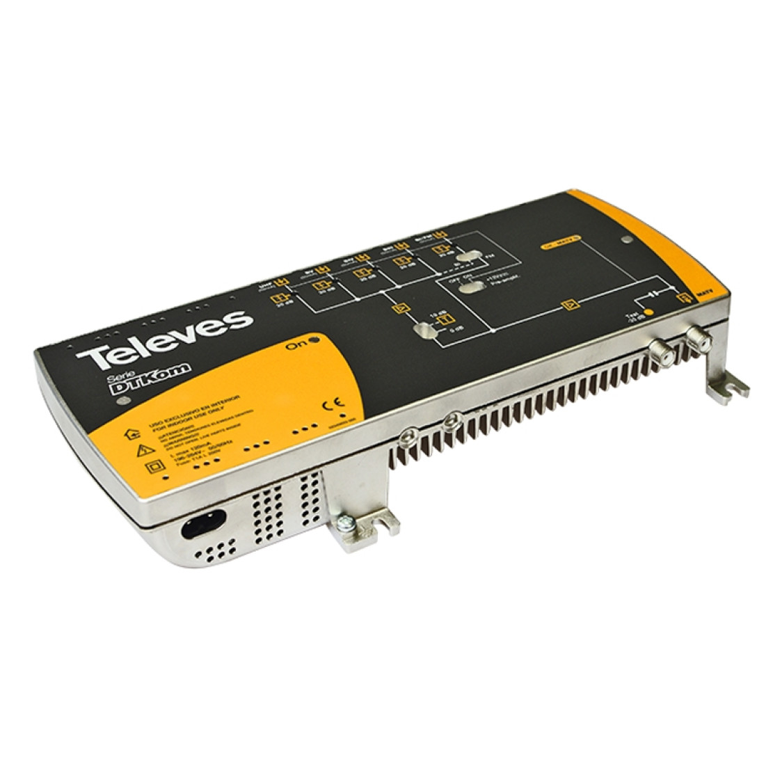 - Τροφοδοσία: (196-264V~ 50/60Hz) - Σύνδεση γείωσης - LED λειτουργίας - Έξοδος test - Έξοδο τροφοδοσίας προς προενισχυτές σε κάθε είσοδο σήματος. - Εξασθενητή σε κάθε είσοδο σήματος. - LED κατάστασης σήματος. Αναμμένο σημαίνει παρουσία σήματος. - Επιλογή ενεργοποίησης για προενισχυτές 12Vdc.(ON/OFF) - Επιλογή Υψηλής/Χαμηλής απολαβής. - Είσοδοι: FM/BIII/BIV/BV/UHF - Εύρος συχνότητας:MHZ 88-108,174-370/470-590/614-862/470-862 - Απολαβή (Υψηλή επιλογή):dB 39,25/44/48/50/50 - Απολαβή (Χαμηλή ρύθμιση):db 31,21/36/39/40/40 - Output level (DIN 45004B) dBμV 123 - Maximum output level (EN 50083) CTB,CSO,XMOD (35ch -60dB) dBμV 120 - Θόρυβος: dB 8, 10/6,5/9/9/8 - Εξασθενητές στις εισόδους UHF και VHF 0-20 - Κατανάλωση: max.W16 - Μέγιστη κατανάλωση προενισχυτών: mA50@12Vdc - Θερμοκρασία λειτουργίας: C -5 . . . +45 - Προστασία: IP20 |